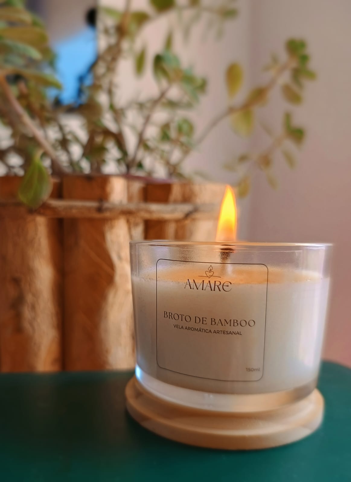 As velas Amare são 100% artesanais e veganas, feitas com cera de coco, pavio de algodão e essências à base de óleo vegetal.